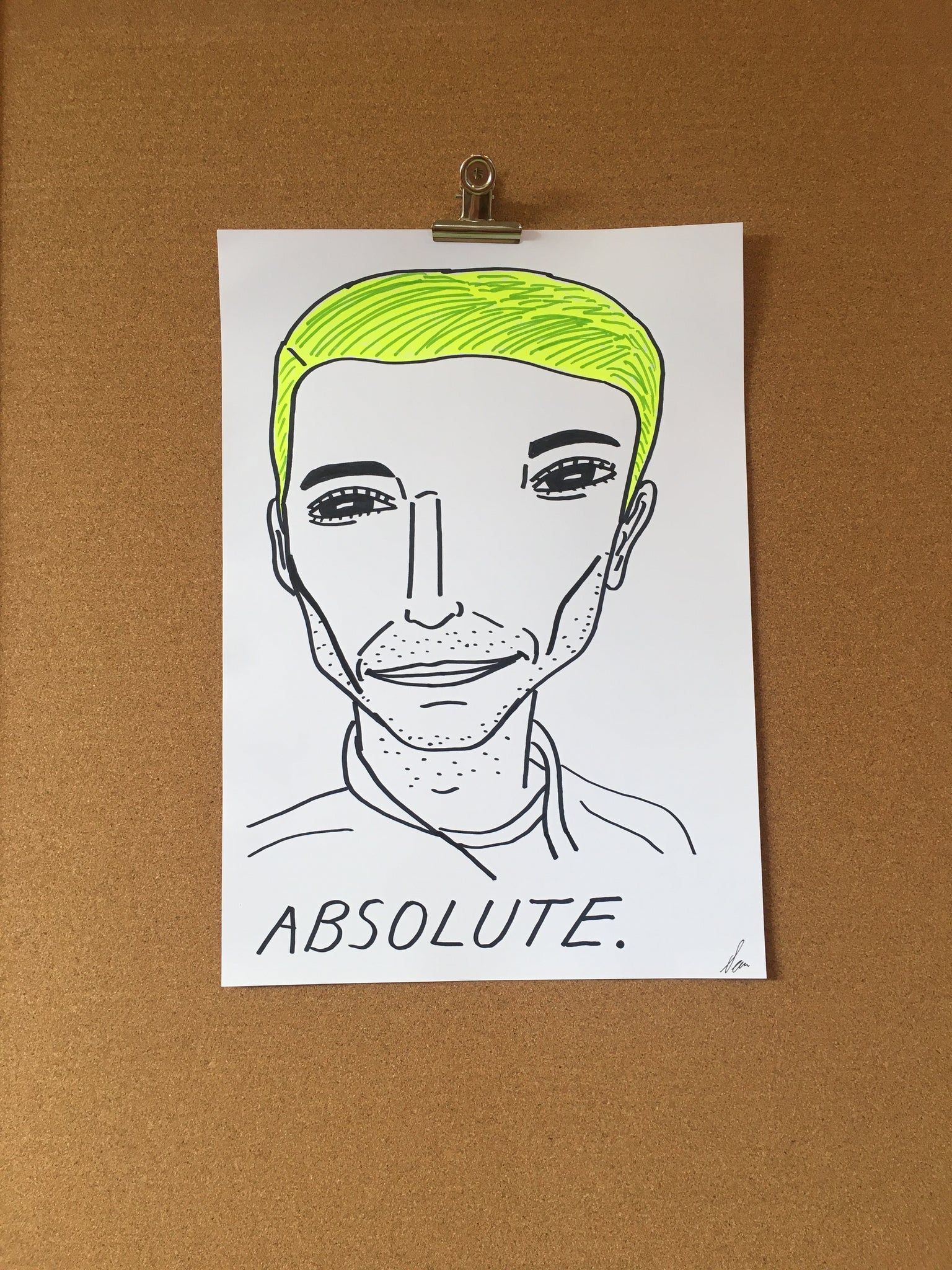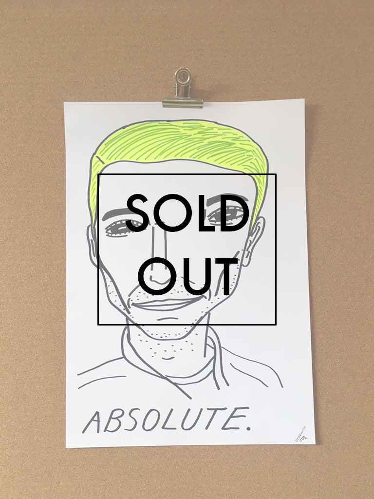 An original, ink on paper badly drawn illustration of ABSOLUTE. by Sean Ryan. Signed by Sean.